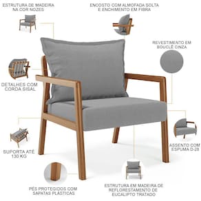 A Poltrona Decorativa Para Sala de Estar e Living Alícia B04 Bouclê Cinza é a peça perfeita para adicionar um toque de estilo moderno a sua sala de estar. Com sua estrutura em madeira maciça envernizada, essa poltrona de madeira traz durabilidade e elegância para o ambiente. O assento estofado e revestido com materiais de qualidade oferece conforto excepcional, permitindo que você relaxe com estilo. Já o design moderno combina perfeitamente com qualquer tipo de decoração, tornando-a uma escolha versátil para qualquer sala de estar, living, recepção, escritório e diversos outros ambientes. A cereja do bolo fica por conta do detalhe da corda trançada no encosto com a almofada sobreposta, um charme à parte.