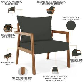 A Poltrona Decorativa Para Sala de Estar e Living Alícia B04 Linho Verde Musgo é a peça perfeita para adicionar um toque de estilo moderno a sua sala de estar. Com sua estrutura em madeira maciça envernizada, essa poltrona de madeira traz durabilidade e elegância para o ambiente. O assento estofado e revestido com materiais de qualidade oferece conforto excepcional, permitindo que você relaxe com estilo. Já o design moderno combina perfeitamente com qualquer tipo de decoração, tornando-a uma escolha versátil para qualquer sala de estar, living, recepção, escritório e diversos outros ambientes. A cereja do bolo fica por conta do detalhe da corda trançada no encosto com a almofada sobreposta, um charme à parte.