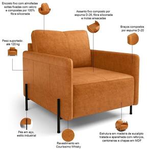 Relaxe com a poltrona Lyam Decor Domani L06, desenvolvida para oferecer conforto e estilo em ambientes internos. Com assento em espuma D26, fibra siliconada e molas ensacadas, proporciona apoio agradável para o uso diário. O revestimento em couro sintético na cor whisky garante toque confortável e visual moderno, enquanto a estrutura em madeira e MDF contribui para maior estabilidade. Os pés em aço com estilo industrial valorizam salas de estar, escritórios e cantinhos de leitura. A combinação de materiais de qualidade reforça a durabilidade e o cuidado no projeto da peça.