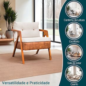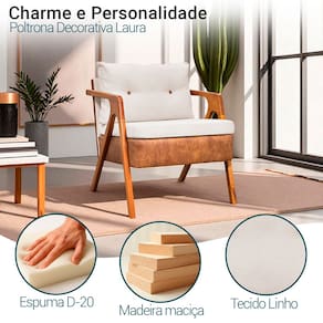 Composição e Estrutura: Sua estrutura em madeira maciça garante resistência e durabilidade para o dia a dia. O encosto com almofada solta, preenchido com fibra siliconada, e o assento em espuma D-20 proporcionam um conforto envolvente. Os braços em madeira e os detalhes sofisticados em tecido corino tornam essa poltrona um verdadeiro destaque no ambiente. Suporta até 120 kg.