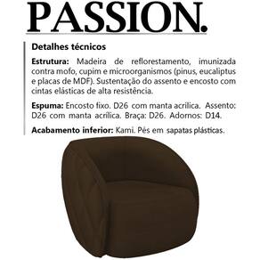 Poltrona Decorativa Passion Veludo, ideal para deixar seu ambiente com um design moderno e versátil, sem abrir mão da qualidade e conforto. Estrutura em madeira de reflorestamento (pinus, eucaliptos e placas de MDF) e cintas elásticas de alta resistência. Composta por madeira imunizada contra mofo, cupim e microrganismos, revestimento em tecido veludo, encosto fixo em espuma D-26 com manta acrílica, assento em espuma D-26 com manta acrílica, braça em espuma D-26, adornos em espuma D-14, acabamento inferior em kami, acompanha sapatas plásticas. É perfeita para acomodar visitas e convidados, ideal para ser utilizada em salas, hall de entrada e escritórios. Este móvel chegará na sua casa separado em 01 volume.