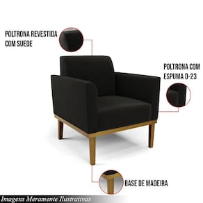Material da Estrutura: Madeira de Eucalipto ReflorestamentoAssento: Espuma D-23Encosto: Espuma D-23Material dos Pés: Base Fixa em MadeiraRevestimento: SuedePeso Suportado: 120kgConteúdo da Embalagem: 1 PoltronaNecessita de Montagem: Somente dos pés Instruções/Cuidado: Evitar exposição ao sol, para que o produto não sofra alterações na cor do tecido. Não limpar com escovas ou produtos abrasivos.