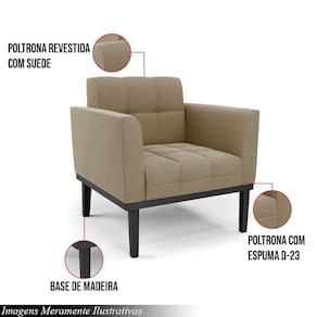 Material da Estrutura: Madeira de Eucalipto ReflorestamentoAssento: Espuma D-23Encosto: Espuma D-23Material dos Pés: Base Fixa em MadeiraRevestimento: SuedePeso Suportado: 120kgConteúdo da Embalagem: 1 PoltronaNecessita de Montagem: Somente dos pés Instruções/Cuidado: Evitar exposição ao sol, para que o produto não sofra alterações na cor do tecido. Não limpar com escovas ou produtos abrasivos.
