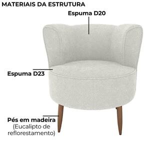 Poltrona Savana, charme orgânico com toque contemporâneo para sua decoração. Com estrutura em Madeira de Eucalipto (reflorestamento) e MDF. Estofada com espumas D23 (assento) e D20 (encosto), revestida em tecido Bouclé (macio e encorpado), possui formato arredondado com encosto tipo concha e 4 pés palito também em madeira. Este produto será entregue em 01 volume.