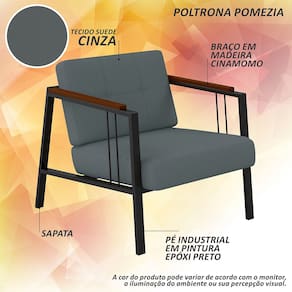 Detalhes Técnicos das Poltronas - Assento e Encosto Tapeçados, Estofados e Fixos - Espuma do Assento e do Encosto: D20 - Tonalidade Estrutura: Preto Fosco -Tonalidade Estofado: Suede Cinza - Material: Metalon - Medida Poltrona: A:80CM x L:73CM x P:88CM - Poltrona suporta até 120KG Conteúdo da Embalagem - 01 Poltrona - Manual de Montagem - Acessórios para Montagem