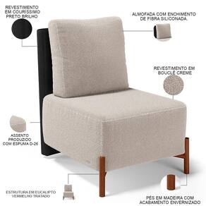 Revestimento do encosto em Couríssimo na cor Preto e do assento em Bouclê na cor Creme, de alta qualidade.
