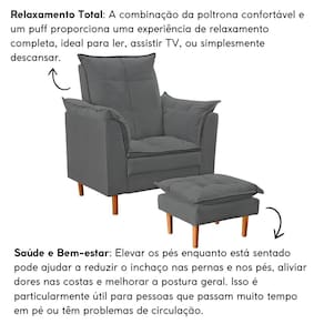 Benefícios da Poltrona para Sala Paris: Versatilidade: Seja para ler um livro, assistir à TV ou simplesmente relaxar, esta poltrona é a escolha ideal para qualquer atividade. Estilo e Funcionalidade: Com um design que combina beleza e praticidade, a poltrona se torna um elemento central na decoração do seu espaço. Conforto Personalizado: Uma poltrona com puff proporciona um nível superior de conforto, permitindo que você estenda e eleve as pernas, o que ajuda a reduzir a pressão nas articulações e a melhorar a circulação sanguínea. Isso é especialmente benéfico após um longo dia de trabalho ou durante momentos de relaxamento.