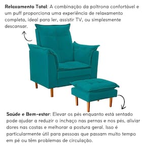 Benefícios da Poltrona para Sala Paris: Versatilidade: Seja para ler um livro, assistir à TV ou simplesmente relaxar, esta poltrona é a escolha ideal para qualquer atividade. Estilo e Funcionalidade: Com um design que combina beleza e praticidade, a poltrona se torna um elemento central na decoração do seu espaço. Conforto Personalizado: Uma poltrona com puff proporciona um nível superior de conforto, permitindo que você estenda e eleve as pernas, o que ajuda a reduzir a pressão nas articulações e a melhorar a circulação sanguínea. Isso é especialmente benéfico após um longo dia de trabalho ou durante momentos de relaxamento.