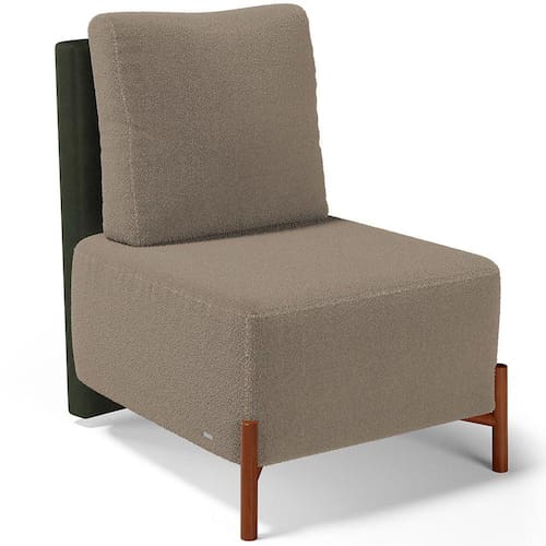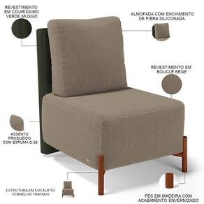 Revestimento do encosto em Couríssimo na cor Verde e do assento em Bouclê na cor Bege, de alta qualidade.