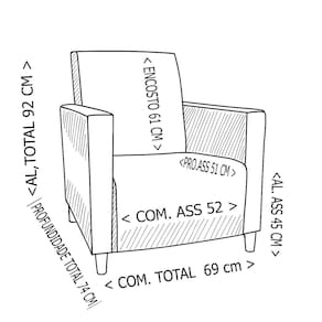Medidas Comprimento Total Frente= 69 cm Comprimento Assento = 52 cm Profundidade Total = 74 cm Profundidade Assento 51 cm Altura Total = 92 cm Altura Encosto = 61 cm Altura Assento = 43 cm