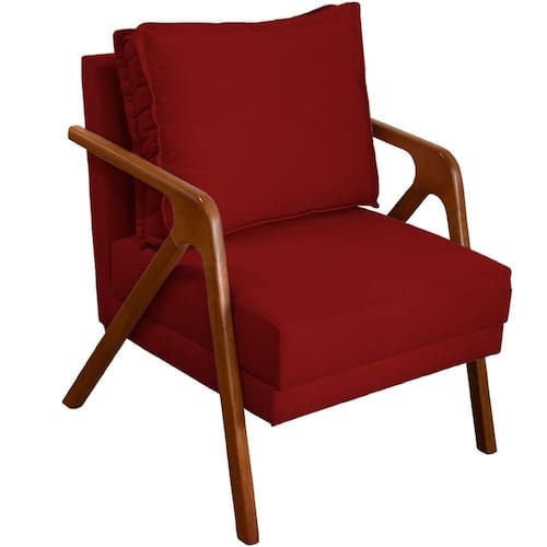 Ademais, os materiais em sua produção permitem uma qualidade excelente, tornando ela confortável por sua espuma D-23, bonita por seu acabamento em tecido suede e forte por seus pés e braças em madeira maciça ( suporta até 150 kg).