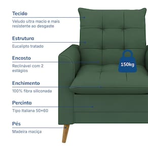 Conteúdo da Embalagem: 1 Poltrona e 1 Puff Características: Marca: Just Time Modelo: York Revestimento: Veludo de Alto Padrão Estrutura: Eucalipto tratado, proviniente de Silvicultura Percinta: Italiana, maior qualidade e conforto Espuma: D26 - Espuma Cerificada