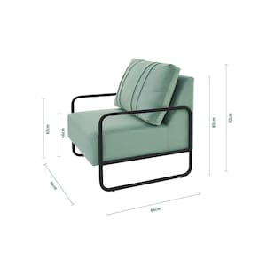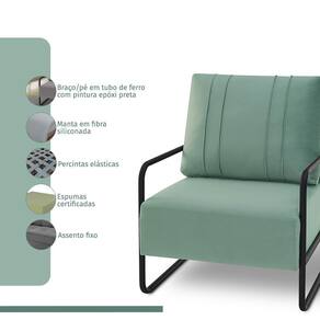 Assento com espuma flexível de poliuretano densidade 26kg/m, certificada, fabricação própria, sustentados por percinta elástica. Enchimento do encosto: 100% fibra siliconadas. Estrutura de madeira maciça de eucalipto 100% reflorestada. Fixação da estrutura: grampos galvanizados anti-ferrugem. Pés em Tubo de ferro com pintura epóxi preta. Revestimento/tecido: veludo 100% poliéster, com toque macio.