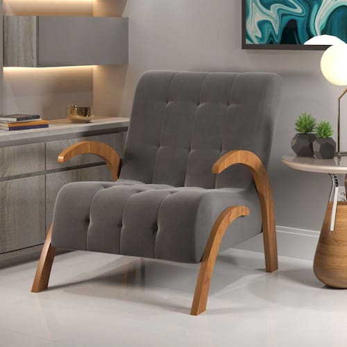 A Poltrona Garden é uma ótima opção para completar a sala de estar, sala de espera ou quarto. Sua estrutura mista em MDP 25mm e madeira de eucalipto de reflorestamento garante mais resistência e durabilidade. O conforto fica por conta do revestimento em espuma no assento e encosto combinado com o uso de percintas no acento, além do acabamento externo em tecido. Além disso, conta com um design diferenciado, trazendo sofisticação e requinte ao ambiente. Acompanha Almofadas extras: Não Acompanha Puff: Não Almofada do assento: Fixa Almofada do encosto: Fixa Altura do assento até o chão: 48,5 cm Altura do Encosto: 56 cm Ambiente Principal: Sala de Estar Complexidade da Montagem: Baixa: pode ser montado por uma pessoa sozinha Cor: Grafite Cor do Produto: Grafite Design Assinado: Não Enchimento do Assento: Espuma D-23 Enchimento do Braço: Não Possui Enchimento do Encosto: Espuma D-20 Encosto para a Cabeça: Não Estampado: Não Extensível: Não Firmeza do Assento: Firme Itens Inclusos: 1 Poltrona, Kit Ferragens e Manual de Montagem Linha ou Coleção: Viero Manual de Montagem e Instalação: https://product-hub-prd.madeiramadeira.com.br/870807/documents/7fd6ebbe-01d6-4691-89fd-ebd0429f4026manualpoltrona.pdf Material do Braço: MDF/MDP Material dos Pés: MDF Modelo de Poltrona: Fixo Necessita Montagem: Sim Origem do Produto: Nacional Peso: 17 kg Possui Percintas Elásticas: Sim Possui Pés: 04 Possui Rodízio: Não Recomendações de Uso, Manutenção e Limpeza: Limpar com pano umedecido com água Sistema de Montagem: Parafusos Suporta Até (kg): 100 kg Tecido Predominante: Veludo Tipo de Assento: Fixo Tipo de Encosto: Fixo Tipo de Espuma do Assento: Espuma Convencional Tipo de Poltrona: Do Papai Ean: 7909903427514