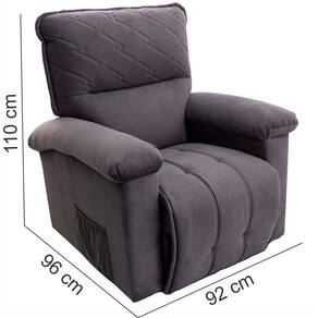 Estrutura: Madeira de reflorestamento certificadaRevestimento: Em tecido VelutAssento: Fixo, em espuma D23 com percintas elásticasEncosto: Reclinável, percintas elásticas com fibras de silicones e flocos de espumaBraço: Fixo, com enchimento em fibras de siliconeEstágio Inclinação: Sim, 02 estágios: Sentado/Leitura descansoPés: Sim, 04 pés em PVC, maior durabilidade resistênciaPeso suportado: Suporta ate 110 KgDimensões do produto montado