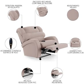 Com um design que alia modernidade e elegância, a Poltrona Reclinável é a escolha perfeita para aqueles que não abrem mão do conforto supremo. Seja mergulhando nas páginas de um bom livro ou se deliciando com seus filmes e séries prediletos, esta Poltrona Do Papai promete ser o seu refúgio particular. A funcionalidade do encosto reclinável, o apoio para os pés e o controle elétrico bi-volt são pensados para proporcionar uma experiência imersiva sem igual. E não é só sobre conforto, mas também sobre durabilidade e estilo, como a madeira maciça de eucalipto e o revestimento de alta qualidade. As dimensões generosas garantem que você tenha espaço de sobra para relaxar, enquanto a capacidade de suportar até 110kg assegura que é uma peça robusta e . Não é apenas uma poltrona, é um upgrade na sua qualidade de vida, trazendo o glamour do cinema diretamente para o seu lar.