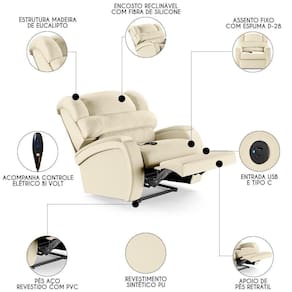 Com um design que alia modernidade e elegância, a Poltrona Reclinável é a escolha perfeita para aqueles que não abrem mão do conforto supremo. Seja mergulhando nas páginas de um bom livro ou se deliciando com seus filmes e séries prediletos, esta Poltrona Do Papai promete ser o seu refúgio particular. A funcionalidade do encosto reclinável, o apoio para os pés e o controle elétrico bi-volt são pensados para proporcionar uma experiência imersiva sem igual. Ah! E ela ainda conta com entrada USB e tipo C ideal para carregar seus eletrônicos enquanto descansa. E não é só sobre conforto, mas também sobre durabilidade e estilo, como a madeira maciça de eucalipto e o revestimento de alta qualidade. As dimensões generosas garantem que você tenha espaço de sobra para relaxar, enquanto a capacidade de suportar até 110kg assegura que é uma peça robusta e . Não é apenas uma poltrona, é um upgrade na sua qualidade de vida, trazendo o glamour do cinema diretamente para o seu lar.