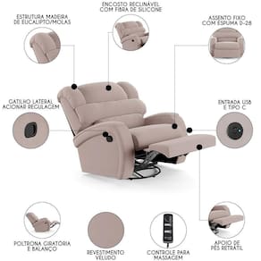 Com seu design moderno e elegante, ela não só complementa a decoração de sua casa, mas também oferece um conforto inigualável. Seja mergulhando nas páginas de um bom livro ou se deliciando com seus filmes e séries prediletos, essa Poltrona Massageadora será o seu refúgio particular. A combinação do sistema glider ao encosto e apoio para os pés ativados com mecanismo manual proporcionam uma experiência de relaxamento total, pois ela é giratória com balanço, e acompanha controle para acionar a massagem. Ah! E ela ainda conta com entrada USB e tipo C ideal para carregar seus eletrônicos enquanto descansa. Fabricada com materiais de alta qualidade, como a madeira de eucalipto e espuma D-28, ela garante durabilidade e suporte. Além disso o revestimento de alta qualidade é um detalhe que enriquece ainda mais a sua experiência. Não deixe escapar a chance de elevar sua sala de estar a um patamar de conforto e estilo com a Poltrona Do Papai.