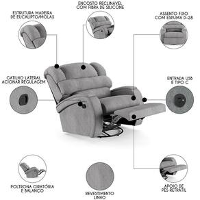 Altura: 95 cm | AssemblyRequired: Sim, sugerimos a contratação do nosso serviço de montagem (para os CEPs em que o serviço está dispon | Color: Cinza | ColorFamily: Cinza | ColorSimple: Cinza | ColorSupplier: Cinza | Cor: Cinza | Gênero: Unisex | Largura: 93 cm | Manual: Sim | Marca: Mpozenato | Material: Madeira de Eucalipto | MaterialFamily: Madeira de Eucalipto | Model: Kalie | Origem: | OriginCountry: | OriginState: PR | Peso: 45 kg | Peso Suportado: 130 Kg | ProductContents: 1 Poltrona | ProductHeight: 95 | ProductInstructions: Produto para uso em ambiente interno, nao devendo ficar exposto ao sol, calor e umidade excessivos. | ProductLength: 96 | ProductWarranty: 90 dias após o do produto | ProductWeight: 45 Kg | ProductWidth: 93 | Profundidade: 96 cm | Requere montagem: Sim | SizeDescription: 95 x 93 x 96 cm | SupplierSimpleName: Poltrona do Papai Reclinável Kalie Glider Giratória USB FH9 Linho Cinza - Mpozenato | Tipo de : Fabricante