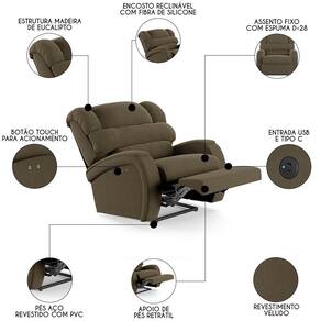 Altura: 95 cm | AssemblyRequired: Sim, sugerimos a contratação do nosso serviço de montagem (para os CEPs em que o serviço está dispon | Color: Capucinno | ColorFamily: Capucinno | ColorSimple: Capucinno | ColorSupplier: Capucinno | Cor: Capucinno | Gênero: Unisex | Largura: 93 cm | Manual: Sim | Marca: Mpozenato | Material: Madeira de Eucalipto | MaterialFamily: Madeira de Eucalipto | Model: Kalie | Origem: | OriginCountry: | OriginState: PR | Peso: 45 kg | Peso Suportado: 130 Kg | ProductContents: 1 Poltrona | ProductHeight: 95 | ProductInstructions: Produto para uso em ambiente interno, nao devendo ficar exposto ao sol, calor e umidade excessivos. | ProductLength: 96 | ProductWarranty: 90 dias após o do produto | ProductWeight: 45 Kg | ProductWidth: 93 | Profundidade: 96 cm | Requere montagem: Sim | SizeDescription: 95 x 93 x 96 cm | SupplierSimpleName: Poltrona do Papai Reclinável Kalie Power Touch USB FH9 Veludo Capuccino - Mpozenato | Tipo de Garantia: Fabricante