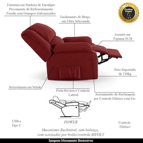 Que tal criar seu próprio home cinema? Aqui, vamos mostrar como você pode montar o seu! Com o local adequado, alguns itens decorativos e uma poltrona ideal, você garantirá um espaço confortável e imersivo. O primeiro passo é investir em equipamentos de alta qualidade! Olha só que lindeza a nossa Poltrona do Papai Reclinável Melim. Ela foi projetada para proporcionar máximo conforto e funcionalidade, esta poltrona é a escolha ideal para quem busca relaxamento, estilo e uma experiência de cinema privada. Essa poltrona conta com Controle Elétrico Bivolt, sendo ela equipada com um sistema elétrico que permite ajustar suas funções, como reclinar o encosto ou levantar o apoio para os pés, usando um controle elétrico. Com capacidade para suportar até 130 kg, oferecendo segurança e estabilidade ao consumidor. O revestimento em Veludo Vermelho oferece um toque de sofisticação e conforto, enquanto a estrutura em Madeira de Lei Eucalipto com Controle de Umidade, Proveniente de Reflorestamento, Fixa com Grampos Galvanizados garante resistência e durabilidade. O Braço foi preenchido em Fibra Siliconada .O Assento/Encosto foi preenchido com espuma D-28, respectivamente, para um conforto adicional. O assento (fixo) e o apoio de Pés Retrátil proporcionam um apoio perfeito para suas pernas, aumentando o conforto. O encosto reclinável, possibilita ajustá- lo para a posição ideal de relaxamento. Já os pés fixos foram feitos em aço revestido com plástico, adicionando um toque de elegância ao produto. E tem mais!! Ela contém Bolso lateral para revistas e controle nas braças perfeito para armazenar livros e outros objetos, mantendo tudo ao seu alcance. Com um design moderno e prático, esta poltrona se tornará o destaque da sua sala de estar. Afinal, sua casa merece a Poltrona do Papai Reclinável Melim Controle Power Elétrico. Adquira a sua agora mesmo e transforme sua sala de estar em um verdadeiro cinema!