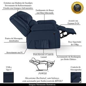 Que tal criar seu próprio home cinema? Aqui, vamos mostrar como você pode montar o seu! Com o local adequado, alguns itens decorativos e uma poltrona ideal, você garantirá um espaço confortável e imersivo. O primeiro passo é investir em equipamentos de alta qualidade! Olha só que lindeza a nossa Poltrona do Papai Reclinável Melim. Ela foi projetada para proporcionar máximo conforto e funcionalidade, esta poltrona é a escolha ideal para quem busca relaxamento, estilo e uma experiência de cinema privada. A facilidade de ajuste com o botão elétrico permite que você encontre a posição perfeita com o toque de um botão com LED, pensado para proporcionar uma experiência imersiva sem igual. A presença do botão elétrico e do controle de massagem eleva o nível de relaxamento, proporcionando uma experiência cinematográfica aliada aos benefícios terapêuticos de uma massagem. Com capacidade para suportar até 130 kg, oferecendo segurança e estabilidade ao consumidor. O revestimento em Sintético PU Azul oferece um toque de sofisticação e conforto, enquanto a estrutura em Madeira de Lei Eucalipto com Controle de Umidade, Proveniente de Reflorestamento, Fixa com Grampos Galvanizados garante resistência e durabilidade. O assento foi preenchido com fibra siliconada com espuma D-28, respectivamente, para um conforto adicional. O assento (fixo) e o apoio de Pés Retrátil proporcionam um apoio perfeito para suas pernas, aumentando o conforto. O encosto reclinável, possibilita ajustá- lo para a posição ideal de relaxamento. Já os pés fixos foram feitos em aço revestido com plástico, adicionando um toque de elegância ao produto. E tem mais!! Ela contém Bolso lateral para revistas e controle nas braças perfeito para armazenar livros e outros objetos, mantendo tudo ao seu alcance. Com um design moderno e prático, esta poltrona se tornará o destaque da sua sala de estar. Afinal, sua casa merece a Poltrona do Papai Reclinável Melim Elétrica LED Massagem. Adquira a sua agora mesmo e transforme sua sala de estar em um verdadeiro cinema!