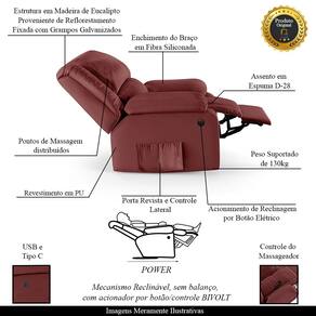 Que tal criar seu próprio home cinema? Aqui, vamos mostrar como você pode montar o seu! Com o local adequado, alguns itens decorativos e uma poltrona ideal, você garantirá um espaço confortável e imersivo. O primeiro passo é investir em equipamentos de alta qualidade! Olha só que lindeza a nossa Poltrona do Papai Reclinável Melim. Ela foi projetada para proporcionar máximo conforto e funcionalidade, esta poltrona é a escolha ideal para quem busca relaxamento, estilo e uma experiência de cinema privada. A facilidade de ajuste com o botão elétrico permite que você encontre a posição perfeita com o toque de um botão com LED, pensado para proporcionar uma experiência imersiva sem igual. A presença do botão elétrico e do controle de massagem eleva o nível de relaxamento, proporcionando uma experiência cinematográfica aliada aos benefícios terapêuticos de uma massagem. Com capacidade para suportar até 130 kg, oferecendo segurança e estabilidade ao consumidor. O revestimento em Sintético PU Vermelho oferece um toque de sofisticação e conforto, enquanto a estrutura em Madeira de Lei Eucalipto com Controle de Umidade, Proveniente de Reflorestamento, Fixa com Grampos Galvanizados garante resistência e durabilidade. O assento foi preenchido com fibra siliconada com espuma D-28, respectivamente, para um conforto adicional. O assento (fixo) e o apoio de Pés Retrátil proporcionam um apoio perfeito para suas pernas, aumentando o conforto. O encosto reclinável, possibilita ajustá- lo para a posição ideal de relaxamento. Já os pés fixos foram feitos em aço revestido com plástico, adicionando um toque de elegância ao produto. E tem mais!! Ela contém Bolso lateral para revistas e controle nas braças perfeito para armazenar livros e outros objetos, mantendo tudo ao seu alcance. Com um design moderno e prático, esta poltrona se tornará o destaque da sua sala de estar. Afinal, sua casa merece a Poltrona do Papai Reclinável Melim Elétrica LED Massagem. Adquira a sua agora mesmo e transforme sua sala de estar em um verdadeiro cinema!