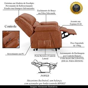 Diferenciais: Apoio de pés retrátil, acompanha controle para acionamento, elevação Lift, e bolso lateral para revistas e livros