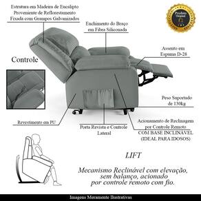 Diferenciais: Apoio de pés retrátil, acompanha controle para acionamento, elevação Lift, e bolso lateral para revistas e livros