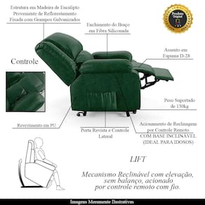 Diferenciais: Apoio de pés retrátil, acompanha controle para acionamento, elevação Lift, e bolso lateral para revistas e livros