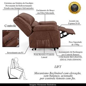 Diferenciais: Apoio de pés retrátil, acompanha controle para acionamento, elevação Lift, e bolso lateral para revistas e livros