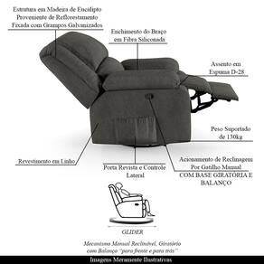 Diferenciais: Apoio de pés retrátil, poltrona giratória e balanço, acompanha controle para ativar massagem, gatilho lateral para acionar regulagem e bolso lateral para revistas e livros