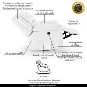 Diferenciais: Apoio de pés retrátil, poltrona giratória e balanço, acompanha controle para ativar massagem, gatilho lateral para acionar regulagem e bolso lateral para revistas e livros