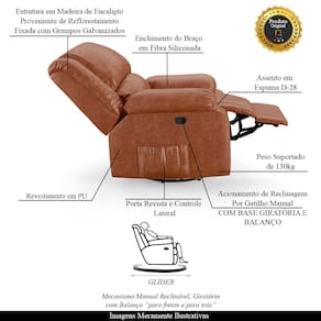 Diferenciais: Apoio de pés retrátil, poltrona giratória e balanço, acompanha controle para ativar massagem, gatilho lateral para acionar regulagem e bolso lateral para revistas e livros