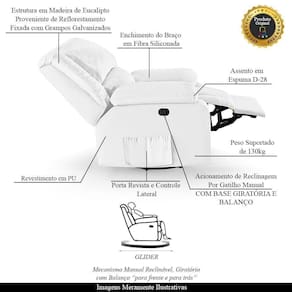 Diferenciais: Apoio de pés retrátil, poltrona giratória e balanço, acompanha controle para ativar massagem, gatilho lateral para acionar regulagem e bolso lateral para revistas e livros