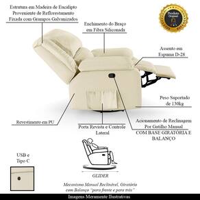 Que tal criar seu próprio home cinema? Aqui, vamos mostrar como você pode montar o seu! Com o local adequado, alguns itens decorativos e uma poltrona ideal, você garantirá um espaço confortável e imersivo. O primeiro passo é investir em equipamentos de alta qualidade! Olha só que lindeza a nossa Poltrona do Papai Reclinável Melim. Ela foi projetada para proporcionar máximo conforto e funcionalidade, esta poltrona é a escolha ideal para quem busca relaxamento, estilo e uma experiência de cinema privada. A poltrona contém sistema glider, acionamento reclinável elétrico por botão em uma das braças, encosto reclinável, apoio para os pés manual além disso ela é giratória com balanço suave perfeito para oferecer um relaxamento total. Este ajuste é feito manualmente, utilizando um gatilho localizado em uma das braças na lateral da poltrona. Ao puxar ou pressionar esse gatilho, o usuário pode reclinar o encosto ou levantar o apoio para os pés, ajustando a poltrona à posição desejada. Com capacidade para suportar até 130 kg, oferecendo segurança e estabilidade ao consumidor. O revestimento em PU Bege oferece um toque de sofisticação e conforto, enquanto a estrutura em Madeira de Lei Eucalipto com Controle de Umidade, Proveniente de Reflorestamento, Fixa com Grampos Galvanizados garante resistência e durabilidade. O Assento/Encosto foi preenchido em Espuma D-28 e o braço foi preenchido com fibra siliconada, respectivamente, para um conforto adicional. O assento (fixo) e o apoio de Pés Retrátil proporcionam um apoio perfeito para suas pernas, aumentando o conforto. O encosto reclinável, possibilita ajustá- lo para a posição ideal de relaxamento. Já os pés giratório foram feitos em aço revestido com plástico, adicionando um toque de elegância ao produto. E tem mais!! Ela contém Bolso lateral para revistas e controle nas braças perfeito para armazenar livros e outros objetos, mantendo tudo ao seu alcance. Com um design moderno e prático, esta poltrona se tornará o destaque da sua sala de estar. Afinal, sua casa merece a Poltrona do Papai Reclinável Melim Glider Giratória. Adquira a sua agora mesmo e transforme sua sala de estar em um verdadeiro cinema!