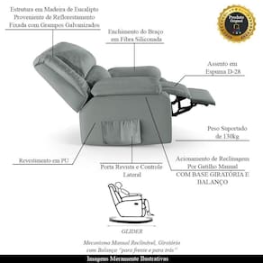 Que tal criar seu próprio home cinema? Aqui, vamos mostrar como você pode montar o seu! Com o local adequado, alguns itens decorativos e uma poltrona ideal, você garantirá um espaço confortável e imersivo. O primeiro passo é investir em equipamentos de alta qualidade! Olha só que lindeza a nossa Poltrona do Papai Reclinável Melim. Ela foi projetada para proporcionar máximo conforto e funcionalidade, esta poltrona é a escolha ideal para quem busca relaxamento, estilo e uma experiência de cinema privada. A poltrona contém sistema glider, acionamento reclinável elétrico por botão em uma das braças, encosto reclinável, apoio para os pés manual além disso ela é giratória com balanço suave perfeito para oferecer um relaxamento total. Este ajuste é feito manualmente, utilizando um gatilho localizado em uma das braças na lateral da poltrona. Ao puxar ou pressionar esse gatilho, o usuário pode reclinar o encosto ou levantar o apoio para os pés, ajustando a poltrona à posição desejada. Com capacidade para suportar até 130 kg, oferecendo segurança e estabilidade ao consumidor. O revestimento em PU Cinza oferece um toque de sofisticação e conforto, enquanto a estrutura em Madeira de Lei Eucalipto com Controle de Umidade, Proveniente de Reflorestamento, Fixa com Grampos Galvanizados garante resistência e durabilidade. O Assento/Encosto foi preenchido em Espuma D-28 e o braço foi preenchido com fibra siliconada, respectivamente, para um conforto adicional. O assento (fixo) e o apoio de Pés Retrátil proporcionam um apoio perfeito para suas pernas, aumentando o conforto. O encosto reclinável, possibilita ajustá- lo para a posição ideal de relaxamento. Já os pés giratório foram feitos em aço revestido com plástico, adicionando um toque de elegância ao produto. E tem mais!! Ela contém Bolso lateral para revistas e controle nas braças perfeito para armazenar livros e outros objetos, mantendo tudo ao seu alcance. Com um design moderno e prático, esta poltrona se tornará o destaque da sua sala de estar. Afinal, sua casa merece a Poltrona do Papai Reclinável Melim Glider Giratória. Adquira a sua agora mesmo e transforme sua sala de estar em um verdadeiro cinema!