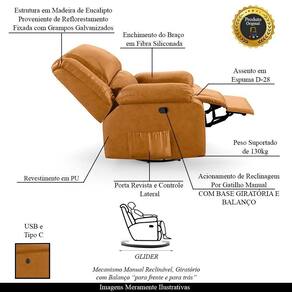 Poltrona Do Papai Reclinável Melim Glider Giratória Usb Pu Fh1 - D'rossi Cor Whisky