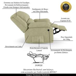 Que tal criar seu próprio home cinema? Aqui, vamos mostrar como você pode montar o seu! Com o local adequado, alguns itens decorativos e uma poltrona ideal, você garantirá um espaço confortável e imersivo. O primeiro passo é investir em equipamentos de alta qualidade! Olha só que lindeza a nossa Poltrona do Papai Reclinável Melim. Ela foi projetada para proporcionar máximo conforto e funcionalidade, esta poltrona é a escolha ideal para quem busca relaxamento, estilo e uma experiência de cinema privada. A praticidade do ajuste elétrico conta com acionamento de reclinagem por botão power elétrico Bivolt em uma das Braças, com apenas um toque, proporcionando a posição ideal, criando uma experiência incomparável. Com capacidade para suportar até 130 kg, oferecendo segurança e estabilidade ao consumidor. O revestimento em Linho Bege oferece um toque de sofisticação e conforto, enquanto a estrutura em Madeira de Lei Eucalipto com Controle de Umidade, Proveniente de Reflorestamento, Fixa com Grampos Galvanizados garante resistência e durabilidade. O encosto e o assento são sustentados por percintas elásticas. O braço/assento possui Enchimento em Fibra Siliconada. O assento foi preenchido com espuma D-28, respectivamente, para um conforto adicional. O assento (fixo) e o apoio de Pés Retrátil proporcionam um apoio perfeito para suas pernas, aumentando o conforto. O encosto reclinável, possibilita ajustá- lo para a posição ideal de relaxamento. Já os pés (fixos) foram feitos em aço revestido com plástico, adicionando um toque de elegância ao produto. E tem mais!! Ela contém Bolso lateral nas braças perfeito para armazenar livros e revistas, mantendo tudo ao seu alcance. Com um design moderno e prático, esta poltrona se tornará o destaque da sua sala de estar. Afinal, sua casa merece a Poltrona do Papai Reclinável Melim Power Elétrica. Adquira a sua agora mesmo e transforme sua sala de estar em um verdadeiro cinema!
