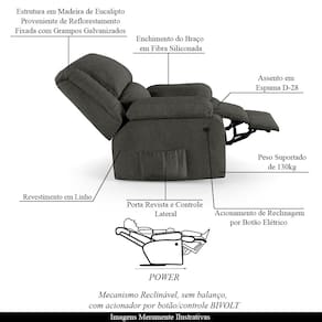 Que tal criar seu próprio home cinema? Aqui, vamos mostrar como você pode montar o seu! Com o local adequado, alguns itens decorativos e uma poltrona ideal, você garantirá um espaço confortável e imersivo. O primeiro passo é investir em equipamentos de alta qualidade! Olha só que lindeza a nossa Poltrona do Papai Reclinável Melim. Ela foi projetada para proporcionar máximo conforto e funcionalidade, esta poltrona é a escolha ideal para quem busca relaxamento, estilo e uma experiência de cinema privada. A praticidade do ajuste elétrico conta com acionamento de reclinagem por botão power elétrico Bivolt em uma das Braças, com apenas um toque, proporcionando a posição ideal, criando uma experiência incomparável. Com capacidade para suportar até 130 kg, oferecendo segurança e estabilidade ao consumidor. O revestimento em Linho Grafite oferece um toque de sofisticação e conforto, enquanto a estrutura em Madeira de Lei Eucalipto com Controle de Umidade, Proveniente de Reflorestamento, Fixa com Grampos Galvanizados garante resistência e durabilidade. O encosto e o assento são sustentados por percintas elásticas. O braço/assento possui Enchimento em Fibra Siliconada. O assento foi preenchido com espuma D-28, respectivamente, para um conforto adicional. O assento (fixo) e o apoio de Pés Retrátil proporcionam um apoio perfeito para suas pernas, aumentando o conforto. O encosto reclinável, possibilita ajustá- lo para a posição ideal de relaxamento. Já os pés (fixos) foram feitos em aço revestido com plástico, adicionando um toque de elegância ao produto. E tem mais!! Ela contém Bolso lateral nas braças perfeito para armazenar livros e revistas, mantendo tudo ao seu alcance. Com um design moderno e prático, esta poltrona se tornará o destaque da sua sala de estar. Afinal, sua casa merece a Poltrona do Papai Reclinável Melim Power Elétrica. Adquira a sua agora mesmo e transforme sua sala de estar em um verdadeiro cinema!