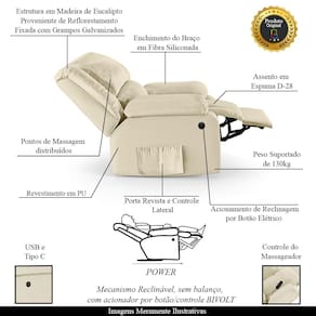 Que tal criar seu próprio home cinema? Aqui, vamos mostrar como você pode montar o seu! Com o local adequado, alguns itens decorativos e uma poltrona ideal, você garantirá um espaço confortável e imersivo. O primeiro passo é investir em equipamentos de alta qualidade! Olha só que lindeza a nossa Poltrona do Papai Reclinável Melim. Ela foi projetada para proporcionar máximo conforto e funcionalidade, esta poltrona é a escolha ideal para quem busca relaxamento, estilo e uma experiência de cinema privada. A praticidade do ajuste elétrico conta com acionamento de reclinagem por botão power elétrico Bivolt em uma das Braças, com apenas um toque, proporcionando a posição ideal, criando uma experiência incomparável. A presença do botão elétrico e do controle de massagem eleva o nível de relaxamento, proporcionando uma experiência cinematográfica aliada aos benefícios terapêuticos de uma massagem. Com capacidade para suportar até 130 kg, oferecendo segurança e estabilidade ao consumidor. O revestimento em PU Bege oferece um toque de sofisticação e conforto, enquanto a estrutura em Madeira de Lei Eucalipto com Controle de Umidade, Proveniente de Reflorestamento, Fixa com Grampos Galvanizados garante resistência e durabilidade. O encosto e o assento são sustentados por percintas elásticas. O braço/assento possui Enchimento em Fibra Siliconada. O assento foi preenchido com espuma D-28, respectivamente, para um conforto adicional. O assento (fixo) e o apoio de Pés Retrátil proporcionam um apoio perfeito para suas pernas, aumentando o conforto. O encosto reclinável, possibilita ajustá- lo para a posição ideal de relaxamento. Já os pés (fixos) foram feitos em aço revestido com plástico, adicionando um toque de elegância ao produto. E tem mais!! A poltrona também possui uma saída USB, que permite que você carregue seu celular ou tablet enquanto você relaxa. Ela contém Bolso lateral nas braças perfeito para armazenar livros e revistas, mantendo tudo ao seu alcance. Com um design moderno e prático, esta poltrona se tornará o destaque da sua sala de estar. Afinal, sua casa merece a Poltrona do Papai Reclinável Melim Power Elétrica Massagem. Adquira a sua agora mesmo e transforme sua sala de estar em um verdadeiro cinema!