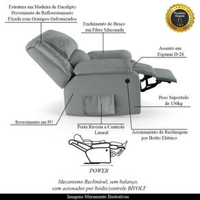 Que tal criar seu próprio home cinema? Aqui, vamos mostrar como você pode montar o seu! Com o local adequado, alguns itens decorativos e uma poltrona ideal, você garantirá um espaço confortável e imersivo. O primeiro passo é investir em equipamentos de alta qualidade! Olha só que lindeza a nossa Poltrona do Papai Reclinável Melim. Ela foi projetada para proporcionar máximo conforto e funcionalidade, esta poltrona é a escolha ideal para quem busca relaxamento, estilo e uma experiência de cinema privada. A praticidade do ajuste elétrico conta com acionamento de reclinagem por botão power elétrico Bivolt em uma das Braças, com apenas um toque, proporcionando a posição ideal, criando uma experiência incomparável. Com capacidade para suportar até 130 kg, oferecendo segurança e estabilidade ao consumidor. O revestimento em PU Cinza oferece um toque de sofisticação e conforto, enquanto a estrutura em Madeira de Lei Eucalipto com Controle de Umidade, Proveniente de Reflorestamento, Fixa com Grampos Galvanizados garante resistência e durabilidade. O encosto e o assento são sustentados por percintas elásticas. O braço/assento possui Enchimento em Fibra Siliconada. O assento foi preenchido com espuma D-28, respectivamente, para um conforto adicional. O assento (fixo) e o apoio de Pés Retrátil proporcionam um apoio perfeito para suas pernas, aumentando o conforto. O encosto reclinável, possibilita ajustá- lo para a posição ideal de relaxamento. Já os pés (fixos) foram feitos em aço revestido com plástico, adicionando um toque de elegância ao produto. E tem mais!! Ela contém Bolso lateral nas braças perfeito para armazenar livros e revistas, mantendo tudo ao seu alcance. Com um design moderno e prático, esta poltrona se tornará o destaque da sua sala de estar. Afinal, sua casa merece a Poltrona do Papai Reclinável Melim Power Elétrica. Adquira a sua agora mesmo e transforme sua sala de estar em um verdadeiro cinema!