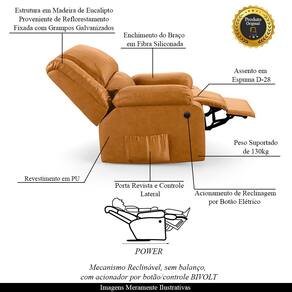 Que tal criar seu próprio home cinema? Aqui, vamos mostrar como você pode montar o seu! Com o local adequado, alguns itens decorativos e uma poltrona ideal, você garantirá um espaço confortável e imersivo. O primeiro passo é investir em equipamentos de alta qualidade! Olha só que lindeza a nossa Poltrona do Papai Reclinável Melim. Ela foi projetada para proporcionar máximo conforto e funcionalidade, esta poltrona é a escolha ideal para quem busca relaxamento, estilo e uma experiência de cinema privada. A praticidade do ajuste elétrico conta com acionamento de reclinagem por botão power elétrico Bivolt em uma das Braças, com apenas um toque, proporcionando a posição ideal, criando uma experiência incomparável. Com capacidade para suportar até 130 kg, oferecendo segurança e estabilidade ao consumidor. O revestimento em PU oferece um toque de sofisticação e conforto, enquanto a estrutura em Madeira de Lei Eucalipto com Controle de Umidade, Proveniente de Reflorestamento, Fixa com Grampos Galvanizados garante resistência e durabilidade. O encosto e o assento são sustentados por percintas elásticas. O braço/assento possui Enchimento em Fibra Siliconada. O assento foi preenchido com espuma D-28, respectivamente, para um conforto adicional. O assento (fixo) e o apoio de Pés Retrátil proporcionam um apoio perfeito para suas pernas, aumentando o conforto. O encosto reclinável, possibilita ajustá- lo para a posição ideal de relaxamento. Já os pés (fixos) foram feitos em aço revestido com plástico, adicionando um toque de elegância ao produto. E tem mais!! Ela contém Bolso lateral nas braças perfeito para armazenar livros e revistas, mantendo tudo ao seu alcance. Com um design moderno e prático, esta poltrona se tornará o destaque da sua sala de estar. Afinal, sua casa merece a Poltrona do Papai Reclinável Melim Power Elétrica. Adquira a sua agora mesmo e transforme sua sala de estar em um verdadeiro cinema!