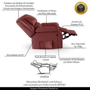 Que tal criar seu próprio home cinema? Aqui, vamos mostrar como você pode montar o seu! Com o local adequado, alguns itens decorativos e uma poltrona ideal, você garantirá um espaço confortável e imersivo. O primeiro passo é investir em equipamentos de alta qualidade! Olha só que lindeza a nossa Poltrona do Papai Reclinável Melim. Ela foi projetada para proporcionar máximo conforto e funcionalidade, esta poltrona é a escolha ideal para quem busca relaxamento, estilo e uma experiência de cinema privada. A praticidade do ajuste elétrico conta com acionamento de reclinagem por botão power elétrico Bivolt em uma das Braças, com apenas um toque, proporcionando a posição ideal, criando uma experiência incomparável. Com capacidade para suportar até 130 kg, oferecendo segurança e estabilidade ao consumidor. O revestimento em PU Vermelho oferece um toque de sofisticação e conforto, enquanto a estrutura em Madeira de Lei Eucalipto com Controle de Umidade, Proveniente de Reflorestamento, Fixa com Grampos Galvanizados garante resistência e durabilidade. O encosto e o assento são sustentados por percintas elásticas. O braço/assento possui Enchimento em Fibra Siliconada. O assento foi preenchido com espuma D-28, respectivamente, para um conforto adicional. O assento (fixo) e o apoio de Pés Retrátil proporcionam um apoio perfeito para suas pernas, aumentando o conforto. O encosto reclinável, possibilita ajustá- lo para a posição ideal de relaxamento. Já os pés (fixos) foram feitos em aço revestido com plástico, adicionando um toque de elegância ao produto. E tem mais!! Ela contém Bolso lateral nas braças perfeito para armazenar livros e revistas, mantendo tudo ao seu alcance. Com um design moderno e prático, esta poltrona se tornará o destaque da sua sala de estar. Afinal, sua casa merece a Poltrona do Papai Reclinável Melim Power Elétrica. Adquira a sua agora mesmo e transforme sua sala de estar em um verdadeiro cinema!