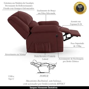 Que tal criar seu próprio home cinema? Aqui, vamos mostrar como você pode montar o seu! Com o local adequado, alguns itens decorativos e uma poltrona ideal, você garantirá um espaço confortável e imersivo. O primeiro passo é investir em equipamentos de alta qualidade! Olha só que lindeza a nossa Poltrona do Papai Reclinável Melim. Ela foi projetada para proporcionar máximo conforto e funcionalidade, esta poltrona é a escolha ideal para quem busca relaxamento, estilo e uma experiência de cinema privada. A praticidade do ajuste elétrico conta com acionamento de reclinagem por botão power elétrico Bivolt em uma das Braças, com apenas um toque, proporcionando a posição ideal, criando uma experiência incomparável. Com capacidade para suportar até 130 kg, oferecendo segurança e estabilidade ao consumidor. O revestimento em Veludo Vinho oferece um toque de sofisticação e conforto, enquanto a estrutura em Madeira de Lei Eucalipto com Controle de Umidade, Proveniente de Reflorestamento, Fixa com Grampos Galvanizados garante resistência e durabilidade. O encosto e o assento são sustentados por percintas elásticas. O braço/assento possui Enchimento em Fibra Siliconada. O assento foi preenchido com espuma D-28, respectivamente, para um conforto adicional. O assento (fixo) e o apoio de Pés Retrátil proporcionam um apoio perfeito para suas pernas, aumentando o conforto. O encosto reclinável, possibilita ajustá- lo para a posição ideal de relaxamento. Já os pés (fixos) foram feitos em aço revestido com plástico, adicionando um toque de elegância ao produto. E tem mais!! A poltrona também possui uma saída USB, que permite que você carregue seu celular ou tablet enquanto você relaxa. Ela contém Bolso lateral nas braças perfeito para armazenar livros e revistas, mantendo tudo ao seu alcance. Com um design moderno e prático, esta poltrona se tornará o destaque da sua sala de estar. Afinal, sua casa merece a Poltrona do Papai Reclinável Melim Power Elétrica USB. Adquira a sua agora mesmo e transforme sua sala de estar em um verdadeiro cinema!
