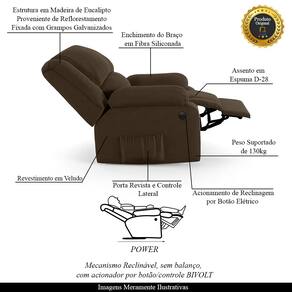Que tal criar seu próprio home cinema? Aqui, vamos mostrar como você pode montar o seu! Com o local adequado, alguns itens decorativos e uma poltrona ideal, você garantirá um espaço confortável e imersivo. O primeiro passo é investir em equipamentos de alta qualidade! Olha só que lindeza a nossa Poltrona do Papai Reclinável Melim. Ela foi projetada para proporcionar máximo conforto e funcionalidade, esta poltrona é a escolha ideal para quem busca relaxamento, estilo e uma experiência de cinema privada. A praticidade do ajuste elétrico conta com acionamento de reclinagem por botão power elétrico Bivolt em uma das Braças, com apenas um toque, proporcionando a posição ideal, criando uma experiência incomparável. Com capacidade para suportar até 130 kg, oferecendo segurança e estabilidade ao consumidor. O revestimento em Veludo Marrom oferece um toque de sofisticação e conforto, enquanto a estrutura em Madeira de Lei Eucalipto com Controle de Umidade, Proveniente de Reflorestamento, Fixa com Grampos Galvanizados garante resistência e durabilidade. O encosto e o assento são sustentados por percintas elásticas. O braço/assento possui Enchimento em Fibra Siliconada. O assento foi preenchido com espuma D-28, respectivamente, para um conforto adicional. O assento (fixo) e o apoio de Pés Retrátil proporcionam um apoio perfeito para suas pernas, aumentando o conforto. O encosto reclinável, possibilita ajustá- lo para a posição ideal de relaxamento. Já os pés (fixos) foram feitos em aço revestido com plástico, adicionando um toque de elegância ao produto. E tem mais!! Ela contém Bolso lateral nas braças perfeito para armazenar livros e revistas, mantendo tudo ao seu alcance. Com um design moderno e prático, esta poltrona se tornará o destaque da sua sala de estar. Afinal, sua casa merece a Poltrona do Papai Reclinável Melim Power Elétrica. Adquira a sua agora mesmo e transforme sua sala de estar em um verdadeiro cinema!