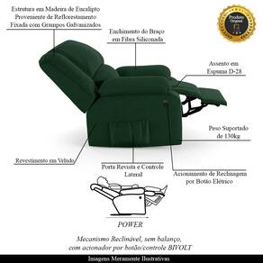 Que tal criar seu próprio home cinema? Aqui, vamos mostrar como você pode montar o seu! Com o local adequado, alguns itens decorativos e uma poltrona ideal, você garantirá um espaço confortável e imersivo. O primeiro passo é investir em equipamentos de alta qualidade! Olha só que lindeza a nossa Poltrona do Papai Reclinável Melim. Ela foi projetada para proporcionar máximo conforto e funcionalidade, esta poltrona é a escolha ideal para quem busca relaxamento, estilo e uma experiência de cinema privada. A praticidade do ajuste elétrico conta com acionamento de reclinagem por botão power elétrico Bivolt em uma das Braças, com apenas um toque, proporcionando a posição ideal, criando uma experiência incomparável. Com capacidade para suportar até 130 kg, oferecendo segurança e estabilidade ao consumidor. O revestimento em Veludo Verde oferece um toque de sofisticação e conforto, enquanto a estrutura em Madeira de Lei Eucalipto com Controle de Umidade, Proveniente de Reflorestamento, Fixa com Grampos Galvanizados garante resistência e durabilidade. O encosto e o assento são sustentados por percintas elásticas. O braço/assento possui Enchimento em Fibra Siliconada. O assento foi preenchido com espuma D-28, respectivamente, para um conforto adicional. O assento (fixo) e o apoio de Pés Retrátil proporcionam um apoio perfeito para suas pernas, aumentando o conforto. O encosto reclinável, possibilita ajustá- lo para a posição ideal de relaxamento. Já os pés (fixos) foram feitos em aço revestido com plástico, adicionando um toque de elegância ao produto. E tem mais!! Ela contém Bolso lateral nas braças perfeito para armazenar livros e revistas, mantendo tudo ao seu alcance. Com um design moderno e prático, esta poltrona se tornará o destaque da sua sala de estar. Afinal, sua casa merece a Poltrona do Papai Reclinável Melim Power Elétrica. Adquira a sua agora mesmo e transforme sua sala de estar em um verdadeiro cinema!