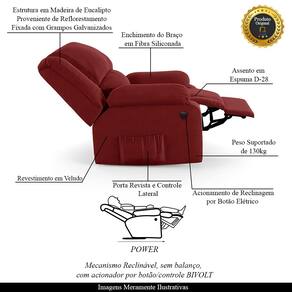 Que tal criar seu próprio home cinema? Aqui, vamos mostrar como você pode montar o seu! Com o local adequado, alguns itens decorativos e uma poltrona ideal, você garantirá um espaço confortável e imersivo. O primeiro passo é investir em equipamentos de alta qualidade! Olha só que lindeza a nossa Poltrona do Papai Reclinável Melim. Ela foi projetada para proporcionar máximo conforto e funcionalidade, esta poltrona é a escolha ideal para quem busca relaxamento, estilo e uma experiência de cinema privada. A praticidade do ajuste elétrico conta com acionamento de reclinagem por botão power elétrico Bivolt em uma das Braças, com apenas um toque, proporcionando a posição ideal, criando uma experiência incomparável. Com capacidade para suportar até 130 kg, oferecendo segurança e estabilidade ao consumidor. O revestimento em Veludo Vermelho oferece um toque de sofisticação e conforto, enquanto a estrutura em Madeira de Lei Eucalipto com Controle de Umidade, Proveniente de Reflorestamento, Fixa com Grampos Galvanizados garante resistência e durabilidade. O encosto e o assento são sustentados por percintas elásticas. O braço/assento possui Enchimento em Fibra Siliconada. O assento foi preenchido com espuma D-28, respectivamente, para um conforto adicional. O assento (fixo) e o apoio de Pés Retrátil proporcionam um apoio perfeito para suas pernas, aumentando o conforto. O encosto reclinável, possibilita ajustá- lo para a posição ideal de relaxamento. Já os pés (fixos) foram feitos em aço revestido com plástico, adicionando um toque de elegância ao produto. E tem mais!! Ela contém Bolso lateral nas braças perfeito para armazenar livros e revistas, mantendo tudo ao seu alcance. Com um design moderno e prático, esta poltrona se tornará o destaque da sua sala de estar. Afinal, sua casa merece a Poltrona do Papai Reclinável Melim Power Elétrica. Adquira a sua agora mesmo e transforme sua sala de estar em um verdadeiro cinema!