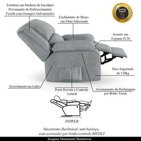 Que tal criar seu próprio home cinema? Aqui, vamos mostrar como você pode montar o seu! Com o local adequado, alguns itens decorativos e uma poltrona ideal, você garantirá um espaço confortável e imersivo. O primeiro passo é investir em equipamentos de alta qualidade! Olha só que lindeza a nossa Poltrona do Papai Reclinável Melim. Ela foi projetada para proporcionar máximo conforto e funcionalidade, esta poltrona é a escolha ideal para quem busca relaxamento, estilo e uma experiência de cinema privada. Com a conveniência do ajuste elétrico por meio de um Power botão touch Bivolt, é possível encontrar a posição ideal com um simples toque, proporcionando uma experiência imersiva única e sem comparações. Ela conta com capacidade para suportar até 130 kg, oferecendo segurança e estabilidade ao consumidor. O revestimento em Linho oferece um toque de sofisticação e conforto, enquanto a estrutura em Madeira de Lei Eucalipto com Controle de Umidade, Proveniente de Reflorestamento, Fixa com Grampos Galvanizados garante resistência e durabilidade. O braço Braço foi preenchido em Fibra Siliconada e assento/encosto foi preenchido com espuma D-28, respectivamente, para um conforto adicional. O assento (fixo) e o apoio de Pés Retrátil proporcionam um apoio perfeito para suas pernas, aumentando o conforto. O encosto reclinável, possibilita ajustá- lo para a posição ideal de relaxamento. Já os pés fixos foram feitos em aço revestido com plástico, adicionando um toque de elegância ao produto. E tem mais!! Ela contém Bolso lateral para revistas e controle nas braças perfeito para armazenar livros e outros objetos, mantendo tudo ao seu alcance. Com um design moderno e prático, esta poltrona se tornará o destaque da sua sala de estar. Afinal, sua casa merece a Poltrona do Papai Reclinável Melim Power Touch. Adquira a sua agora mesmo e transforme sua sala de estar em um verdadeiro cinema!