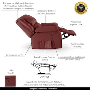 Que tal criar seu próprio home cinema? Aqui, vamos mostrar como você pode montar o seu! Com o local adequado, alguns itens decorativos e uma poltrona ideal, você garantirá um espaço confortável e imersivo. O primeiro passo é investir em equipamentos de alta qualidade! Olha só que lindeza a nossa Poltrona do Papai Reclinável Melim. Ela foi projetada para proporcionar máximo conforto e funcionalidade, esta poltrona é a escolha ideal para quem busca relaxamento, estilo e uma experiência de cinema privada. Com a conveniência do ajuste elétrico por meio de um Power botão touch Bivolt em uma das Braças, é possível encontrar a posição ideal com um simples toque, proporcionando uma experiência imersiva única e sem comparações. Contém também uma saída USB, que permite que você carregue seu celular enquanto relaxa. Ela conta com capacidade para suportar até 130 kg, oferecendo segurança e estabilidade ao consumidor. O revestimento em Sintético PU oferece um toque de sofisticação e conforto, enquanto a estrutura em Madeira de Lei Eucalipto com Controle de Umidade, Proveniente de Reflorestamento, Fixa com Grampos Galvanizados garante resistência e durabilidade. O braço Braço foi preenchido em Fibra Siliconada e assento/encosto foi preenchido com espuma D-28, respectivamente, para um conforto adicional. O assento (fixo) e o apoio de Pés Retrátil proporcionam um apoio perfeito para suas pernas, aumentando o conforto. O encosto reclinável, possibilita ajustá- lo para a posição ideal de relaxamento. Já os pés fixos foram feitos em aço revestido com plástico, adicionando um toque de elegância ao produto. E tem mais!! Ela contém Bolso lateral para revistas e controle nas braças perfeito para armazenar livros e outros objetos, mantendo tudo ao seu alcance. Com um design moderno e prático, esta poltrona se tornará o destaque da sua sala de estar. Afinal, sua casa merece a Poltrona do Poltrona do Papai Reclinável Melim Power Touch USB. Adquira a sua agora mesmo e transforme sua sala de estar em um verdadeiro cinema!